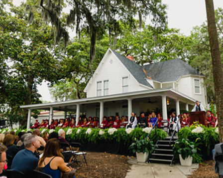 Enjoy the moment with twelve front row seats located on the left side of the Acosta-Schmidt House porch for Commencement 2023. This package includes two VIP parking spaces and twelve reserved seats. No stress before the ceremony - just enjoy. CONGRATULATIONS!